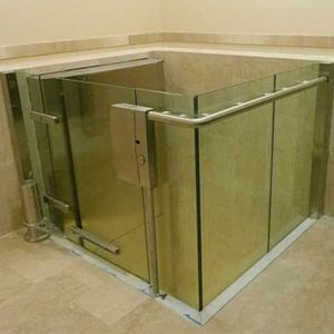 Elevatore senza cabina chiusa con cancello a mezza altezza al piano superiore.